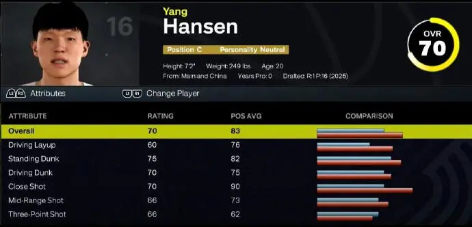 虎扑08月26日讯 近日,有网友分享了杨瀚森在NBA2K26中的各项能力值数据。
