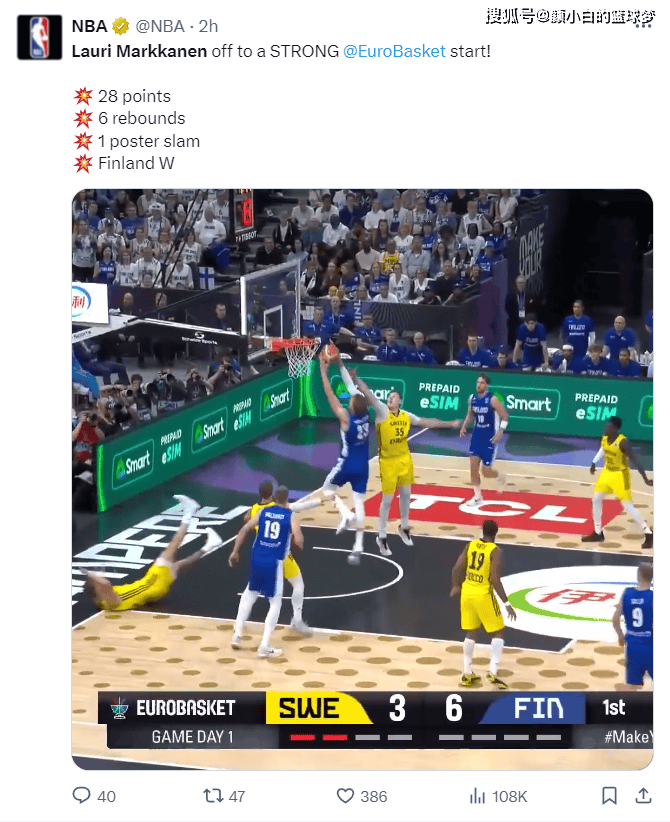 这场比赛芬兰赢球的第一功臣肯定就是马尔卡宁,NBA官方赛后回顾了马卡的炸裂发挥,刚刚开场马卡持球突破直接将一个防守球员撞飞3米远随后马卡完成双手暴扣,马卡在FIBA赛场上如同勒布朗-詹姆斯一般。