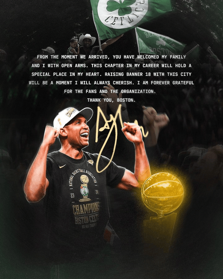 霍福德也已经正式发文告别并感谢绿军,他在社媒上写到:“从我和家人来到这里的那一刻起,你们就向我们敞开怀抱,热情接纳。职业生涯中的这一篇章,在我心中占据着特殊的位置。与这座城市一同升起第18面冠军旗帜的时刻,我将永远珍藏。我对球迷们和整个球队组织永远心怀感激。谢谢你,波士顿。”