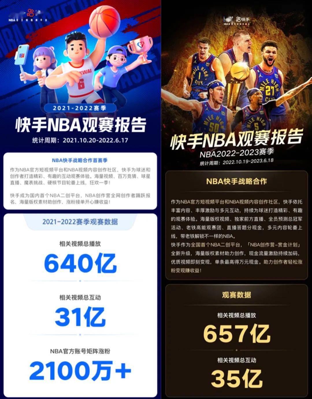 仅2021-22赛季和2022-23赛季,快手上NBA相关作品获得的总播放量分别为640亿和657亿,总互动量分别为31亿和35亿。