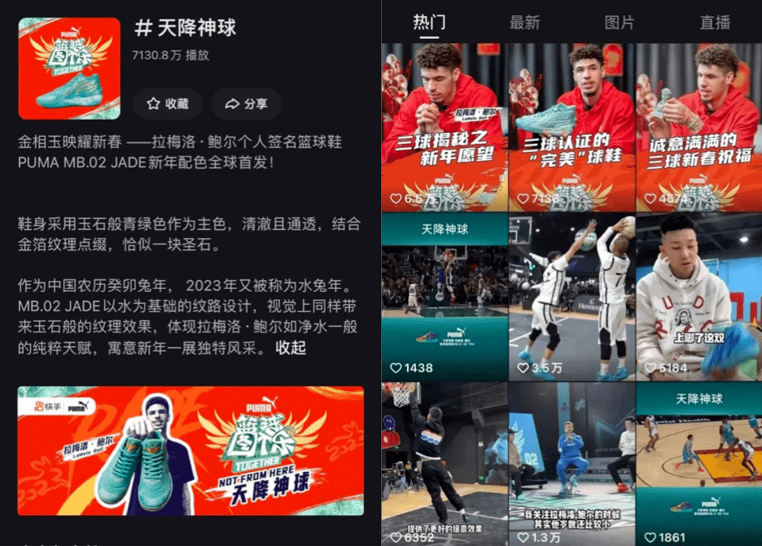 为了宣传MB.02 JADE 中国新年配色,PUMA 再度将目光锁定快手。有了双方在MB.01的成熟合作经验,快手用户对于品牌的好感度,对品牌内容的信任感产生叠加效果,更为精细化的运营内容成为新合作的破题关键。