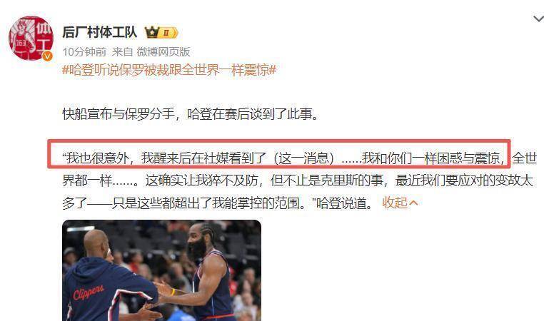 这场突如其来的分手,让快船队内的两位超级巨星也感到措手不及。在战胜老鹰队的赛后,詹姆斯·哈登被问及此事时直言不讳地表示:“我也很意外,我醒来后在社交媒体上看到了这一消息,我和你们一样困惑和震惊,全世界都一样,这让我感到猝不及防。”