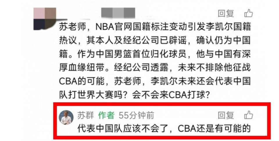 然而,保留国籍并不等同于即战力。资深篮球评论员苏群在与网友互动时,对李凯尔在国家队层面的前景给出了相当冷静甚至稍显残酷的判断:“代表中国队应该不会了,CBA还是有可能的。”这一观点虽然听起来令人唏嘘,却符合竞技体育的客观规律。中国男篮目前正处于新老交替的阵痛期,彻底无缘巴黎奥运会意味着球队将进入长达四年的重建循环。届时,李凯尔的年龄将不再具备优势,国家队在这一周期内更需要挖掘本土年轻核心,而非依赖一位老将去冲击遥不可及的短期成绩。