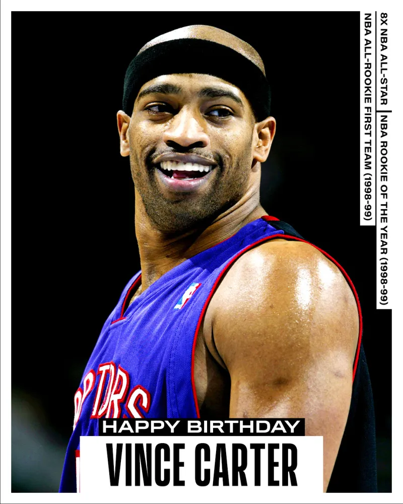 “让我们一起祝8届全明星,1998-99赛季最佳新秀文斯-卡特49岁生日快乐!”NBA官方附文道。