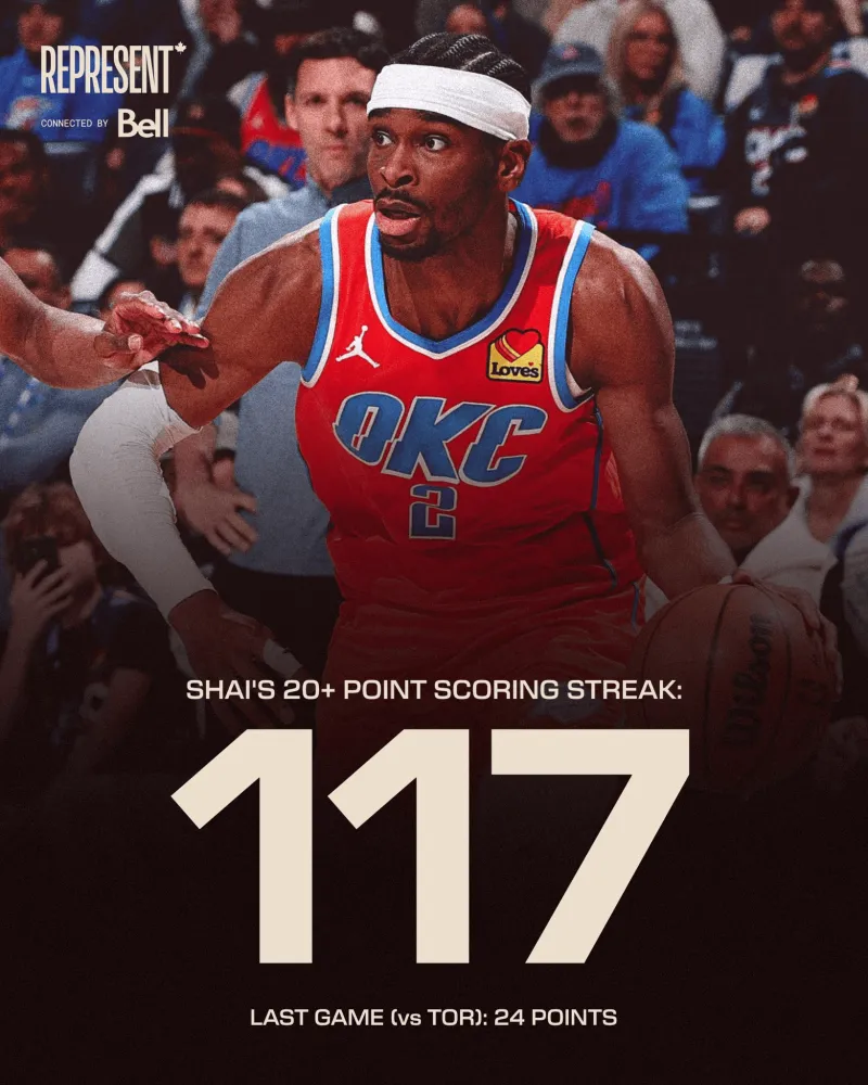 NBA官方晒照:亚历山大已经连续117场得到20+,他继续排在这项数据的历史第二,第一是威尔特-张伯伦的连续126场。