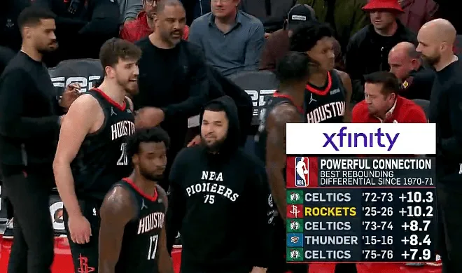 比赛的第四节,转播画面给出一组数据,内容为NBA历史场均净胜对手篮板数的榜单,详情如下: